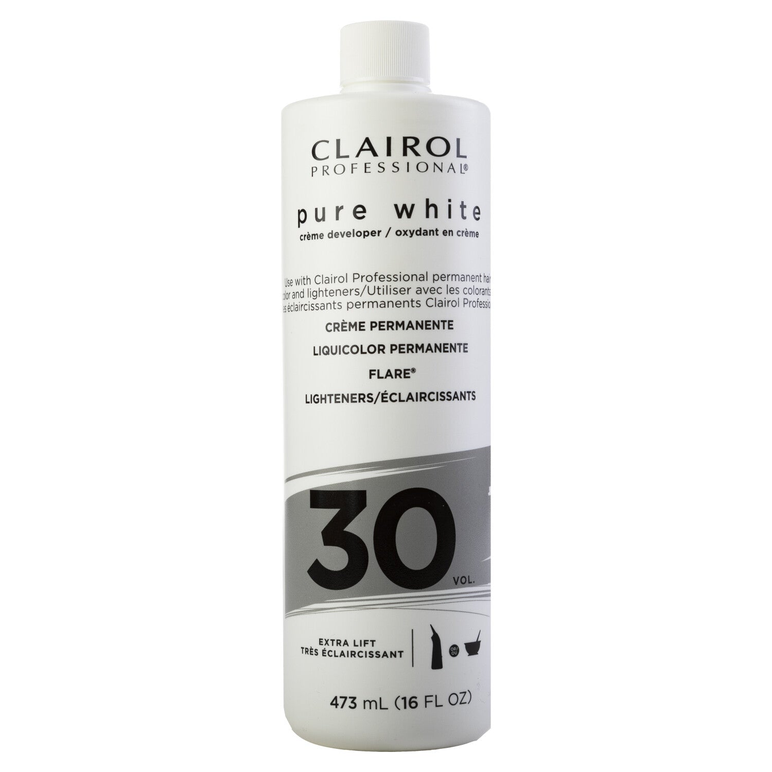 Create extra lift with this professional formula developer that mixes with any Clairol professional hair color. 30 Volume Pure White in 16 fl. oz. bottle creates lightening while still helping to maintain hair moisture. Cream consistency spreads and mixes easily and ideal for use with bowl and brush. Lab stabilized for consistent results through the hole bottle. From Clairol Professional.