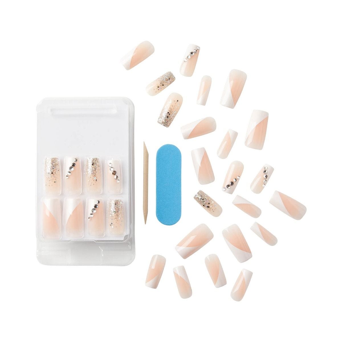 Elevate your manicure with KISS Classy Premium Nails, a perfect fusion of timeless French elegance and modern glam. Featuring sophisticated lengths and chic shapes, these nails are adorned with glitter and rhinestone accents for a high-end, salon-quality finish. Designed for effortless at-home application, they offer a flawless, long-lasting look that complements any occasion with a touch of luxury.