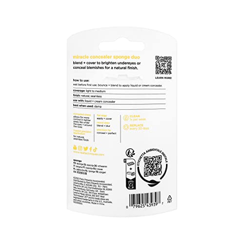The Real Techniques Miracle Concealer Sponge Duo helps blend and conceal to brighten undereyes or cover blemishes. Our concealer sponge offers light to medium coverage for a natural, seamless finish that gives you a lifted effect. This makeup blending sponge has a unique elongated shape that allows for more precise application and control in tighter areas like under the eyes and around the nose. Real Techniques' Miracle Concealer Sponge works best with liquid and cream concealer. This makeup sponge has RT's unique 3-point application technique that makes blending like a pro easy. First use the flat edge to apply and cover, then the precision tip to conceal and perfect, and finally, blend it all out with the rounded side. The concealer sponge is best used damp and is easy to clean using our Real Techniques Brush + Sponge Cleansing Gel. It’s also 100% cruelty-free, vegan, and designed with revolutionary latex-free foam technology.