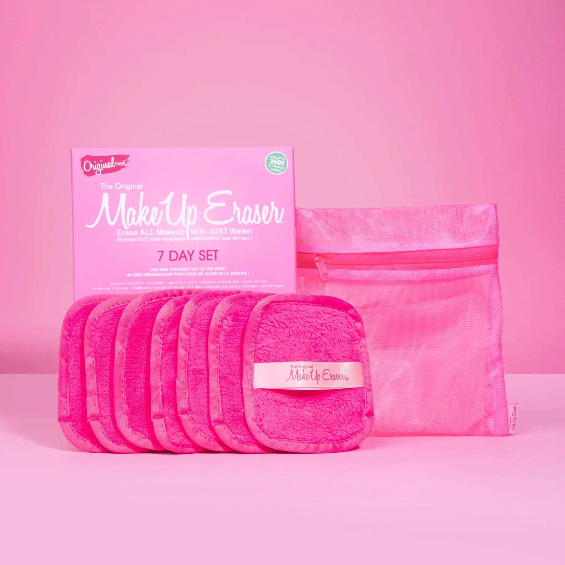 Erase ALL Makeup with JUST Water using the #1 sustainable makeup remover in the world! Including waterproof mascara eyeliner foundation lipstick and more! The Original MakeUp Eraser is a premium patented polyester cloth made up of millions of tiny hair-like fibers that work together to create a suction for all dirt makeup and oil in your pores. Double-sided to erase makeup with the short fiber side and exfoliate the skin with the long fiber side (side with tag). Reusable machine washable and lasts 3 to 5 years. 1 MakeUp Eraser is equal to 3 600 makeup wipes! No added chemicals less waste ultra-soft dermatologist approved and great for sensitive skin. Free of alcohol oils astringents parabens fragrances and sulfates. The Original Pink 7-Day Set includes 7 MakeUp Erasers (approximately 5in x 4in) and 1 laundry bag (approximately 6in x 5in). One MakeUp Eraser for every day of the week! PRO TIP: Use to erase makeup apply toner or remove face masks. #nomorewipes.